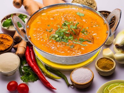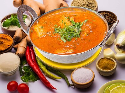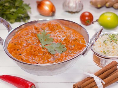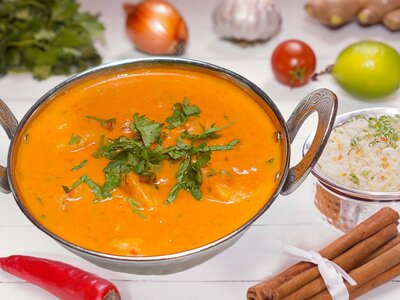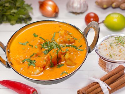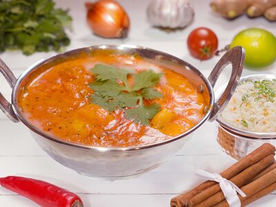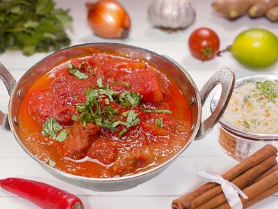 Traditional dish cooked with boneless chicken, garlic, ginger, tomato and curry spices, served with a side of rice
