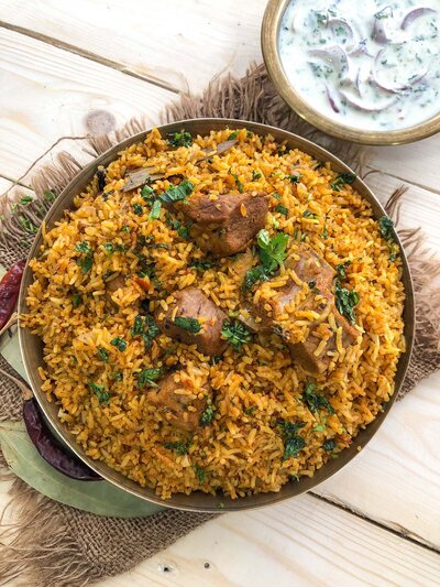 Basmati rice cooked with lamb, onions, garlic, ginger, raisins, and spices served with side of raita.