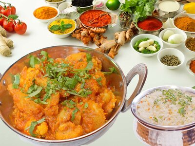 Potatoes and cauliflower cooked with onions, tomatoes, garlic, ginger and spices, served with a side of rice.
